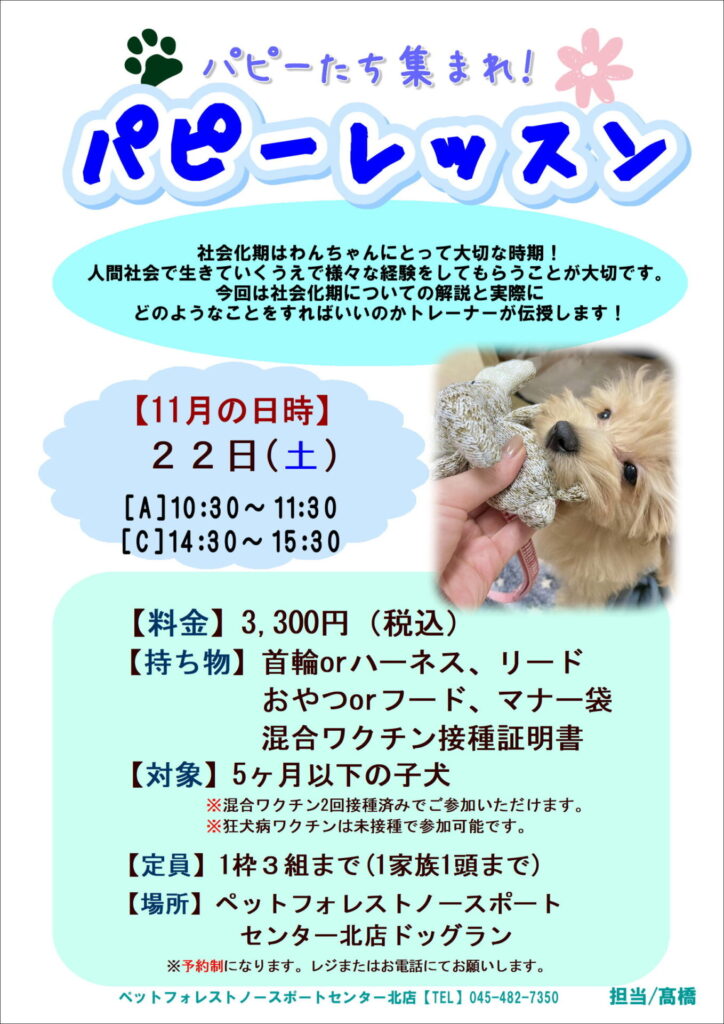 【2025年11月15日(土)】パピーレッスン開催🐾 開催期間: 2025.11.15 ~ 2025.11.15 掲載日時:2025.10.12 お知らせ&セール 関連記事: 【2025年10月13日(月祝)】パピーレッスン開催🐾 【2025年11月22日(土)】パピーレッスン開催! 《美容》ネット予約開始します! 年末年始の営業について 取扱店舗 鷺沼店 Tweet News一覧へ