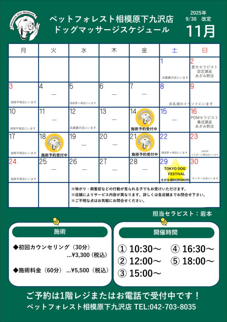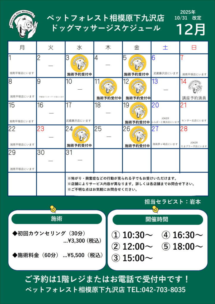 パーシヴ・ドッグマッサージのご案内 掲載日時:2025.11.01 お知らせ&セール いつもペットフォレスト相模原下九沢店をご利用いただき誠にありがとうございます。 パーシヴ・ドッグマッサージのご案内です。 パピーさんの免疫力アップやシニアさんの健康増進にいかがでしょうか? ご予約はレジまたはお電話で承っております。 関連記事: パーシヴ・ドッグマッサージのご案内 11/15(土)パーシヴ・ドッグマッサージ 11/1(土)ドッグマッサージ体験イベント パーシヴ・ドッグマッサージ施術のごあんない 取扱店舗 相模原下九沢店 Tweet News一覧へ