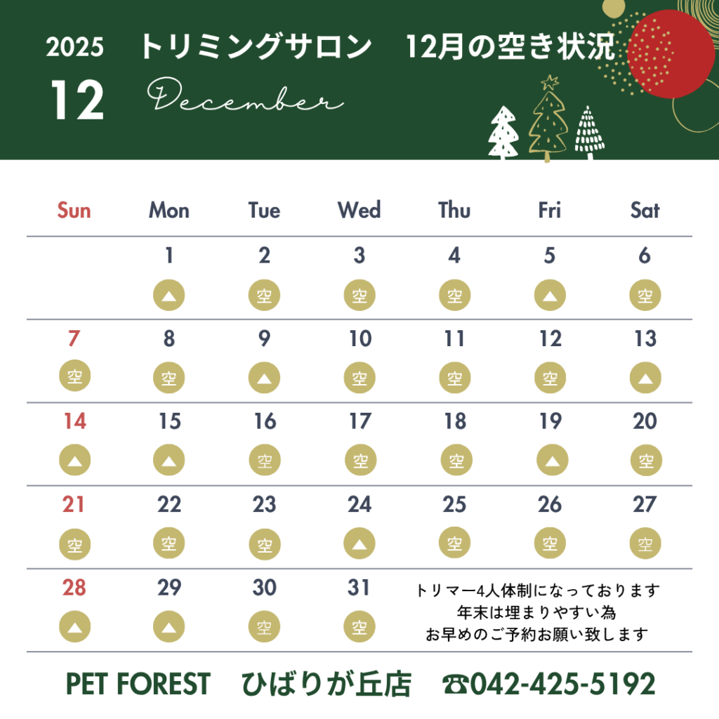 11月・12月のグルーミング・トリミングのご予約が集中し、大変埋まりやすくなっております!!