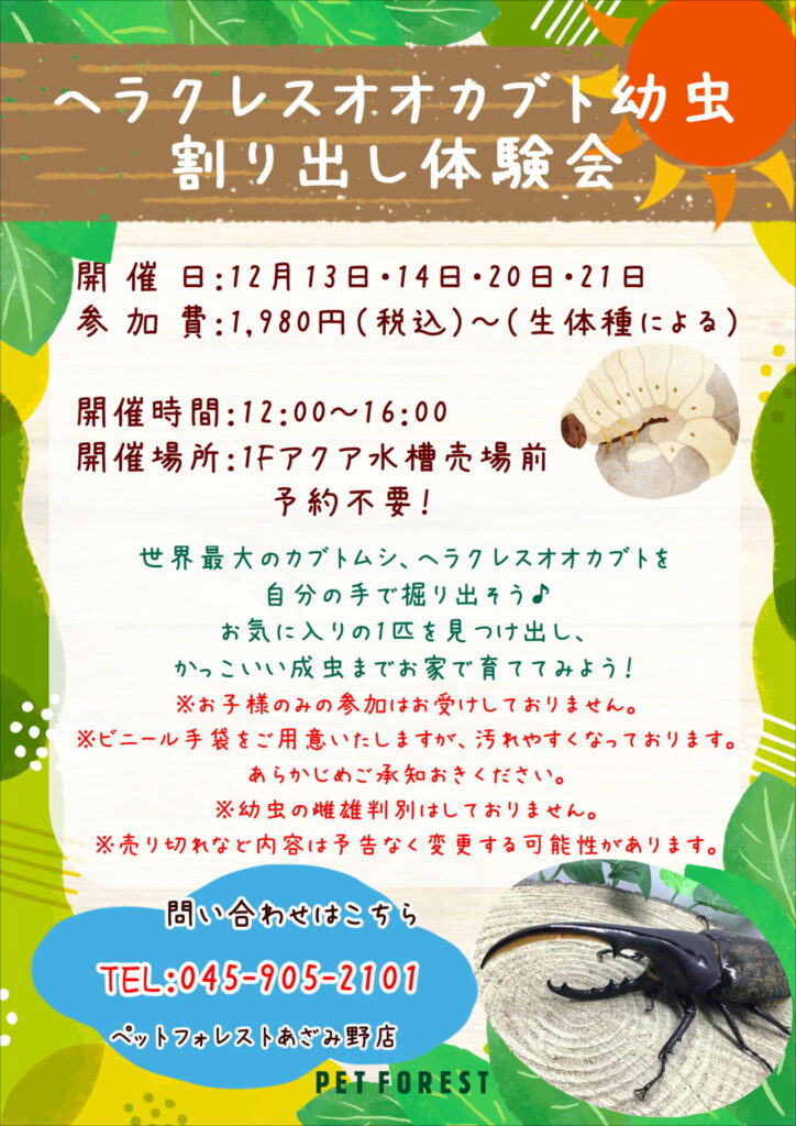 【カブト・クワガタ】ヘラクレスオオカブト幼虫掘り出しイベント、開催決定! 開催期間: 2025.12.13 ~ 2025.12.21 掲載日時:2025.11.28 イベント いつもご利用ありがとうございます! ペットフォレストあざみ野店の昆虫担当です。 12月にヘラクレスオオカブトの幼虫掘り出しイベントの開催が決定しました! 詳細は下の画像をご覧ください! 用意する生体は、ヘラクレスオオカブトを中心にいくつかご用意する予定です…! こうご期待! 関連記事: 【カブト・クワガタ】2025年5月入荷情報(あざみ野店) 【カブト・クワガタ】2025年6・7・8月入荷情報(あざみ野店) 【カブト・クワガタ】2025年9月入荷情報(あざみ野店) 【カブト・クワガタ】2025年10月入荷情報(あざみ野店) 取扱店舗 あざみ野店 Tweet News一覧へ