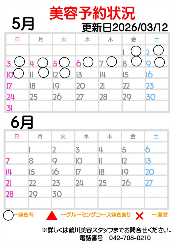 ☆美容予約状況☆ 掲載日時:2026.03.12 お知らせ&セール 関連記事: ペットフォレスト公式オンラインストアのご案内 犬猫生体ブース営業時間変更のお知らせ 【売場】アミーゴオリジナル商品「うちの子シリーズ」のご紹介✨ 室内ドッグランご利用案内 取扱店舗 鶴川店 Tweet News一覧へ