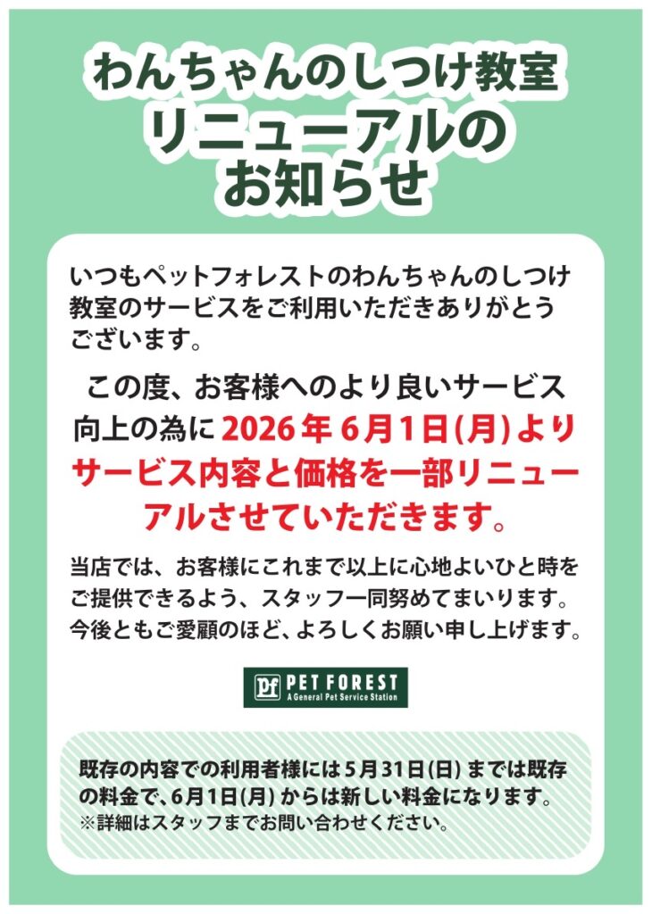 【2026年6月1日(月)】しつけサービス価格改定のお知らせ 開催期間: 2026.06.01 ~ 掲載日時:2026.04.09 お知らせ&セール 関連記事: 【2026年6月1日(月)】しつけサービス価格改定のお知らせ ペットフォレスト公式オンラインストアのご案内 【9月祭り】開催します!!! 12月の試食会のお知らせ📢 取扱店舗 鷺沼店 Tweet News一覧へ