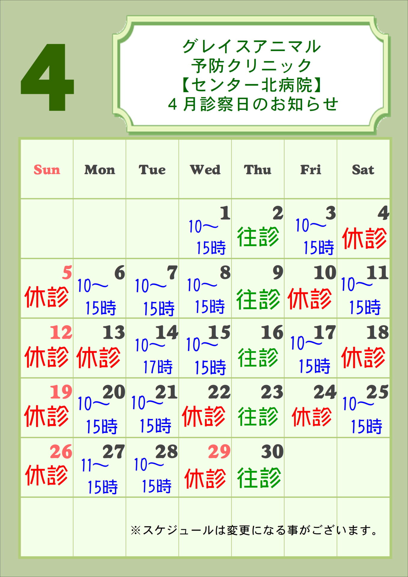 PFグレイスアニマル予防クリニックノースポートセンター北病院 4月診療日のお知らせ