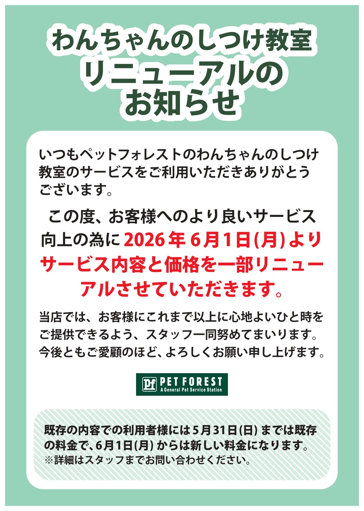 わんちゃんのしつけサービス価格改定のお知らせ