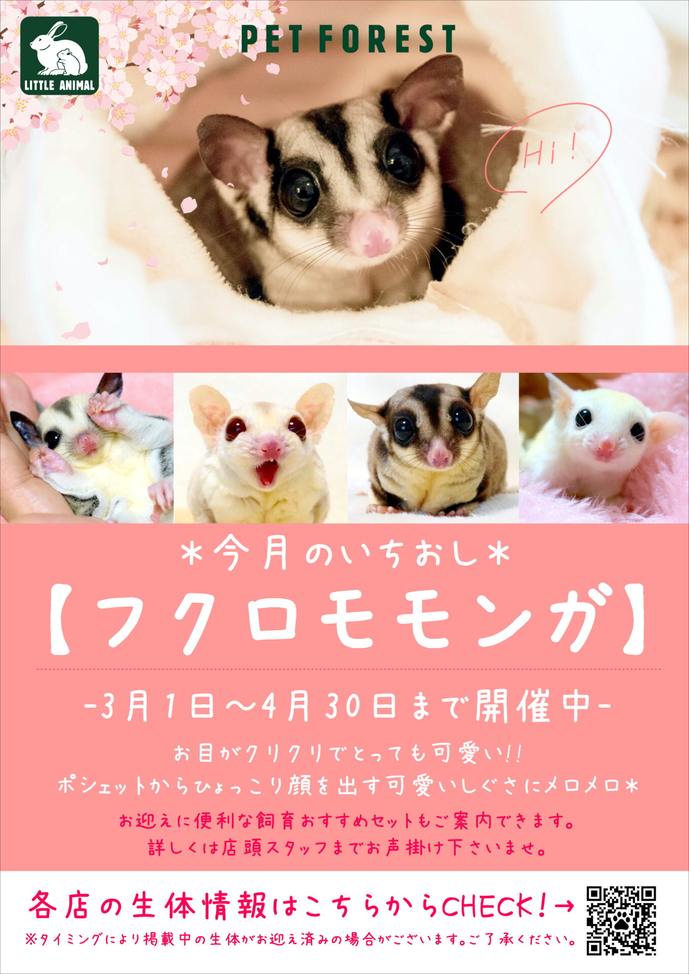 🌸只今ペットフォレストでは3/1〜4/30までフクロモモンガフェアでいちおししております!
