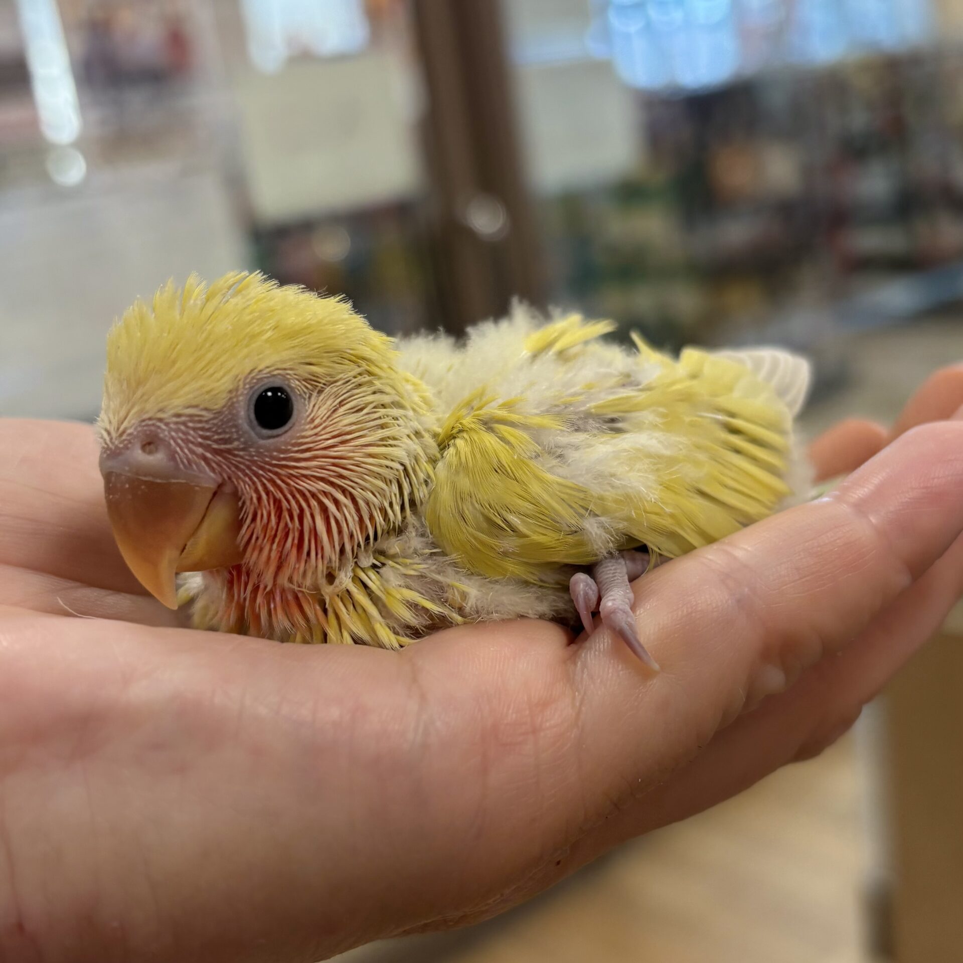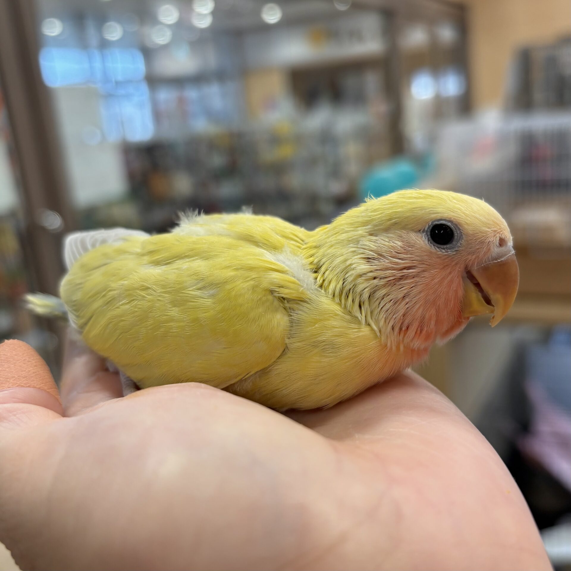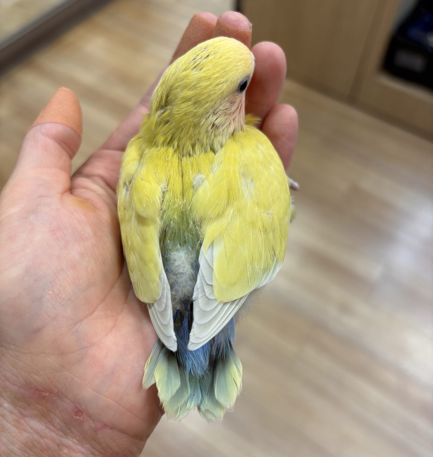 こちらの子は「アメリカンチェリー」と呼ばれるカラーで、黄色い体にオレンジがかったお顔、おしりの方は緑と青が混ざっていてとてもきれいです✨