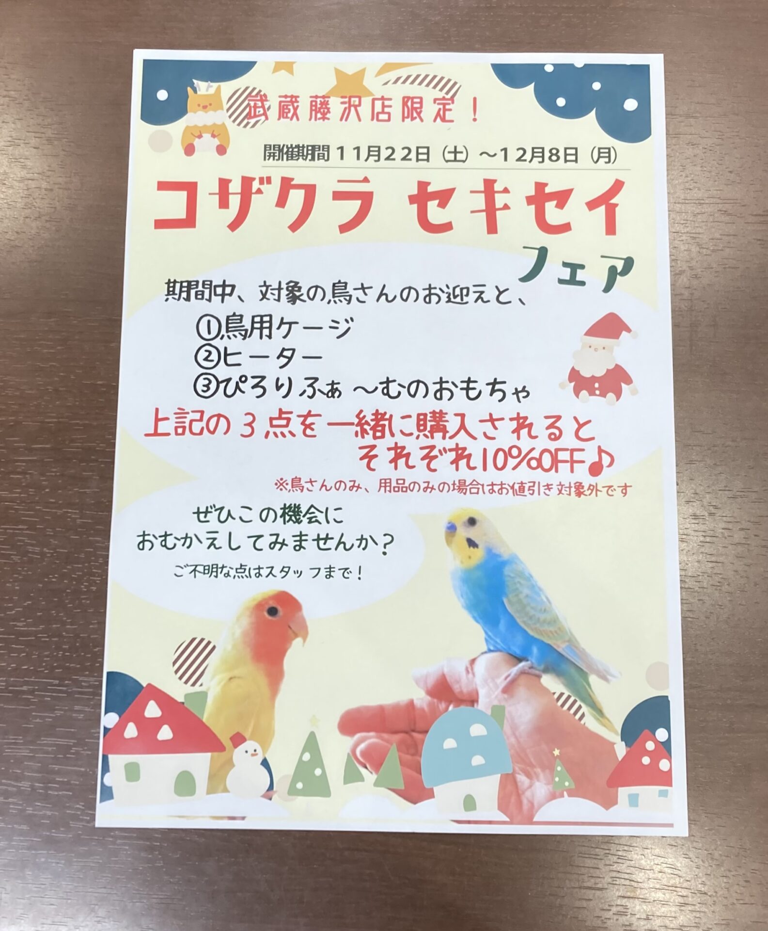 | コメント | ⭐️武蔵藤沢店限定⭐️ 11月22日〜12月8日まで コザクラ・セキセイインコフェア開催中🦜 今なら通常売価よりお迎えしやすくなっております♪ この機会に是非ご来店くださいませ☆ |