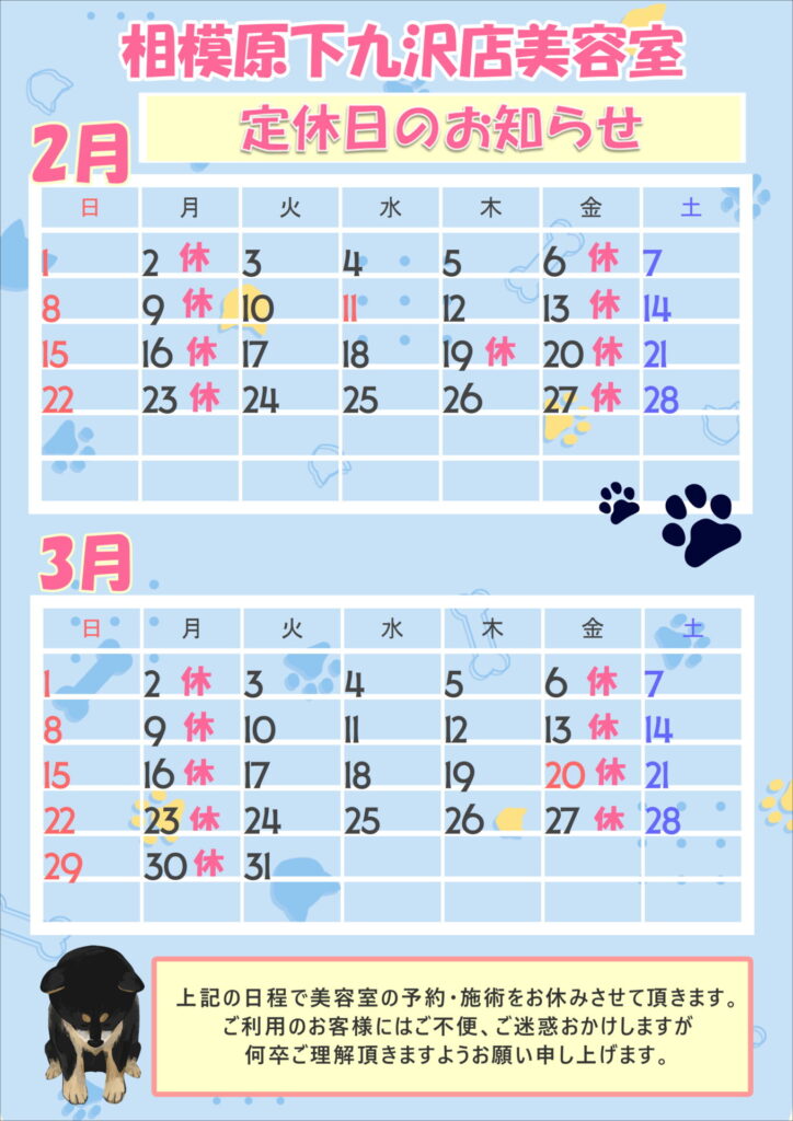 【26年2月・3月】相模原下九沢店美容室より定休日のお知らせ